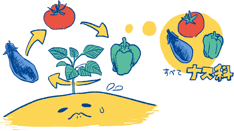 | 連作障害を防ぐバランスのよい土作りが大切です。 | 同じ科の野菜を植えることで、土から吸収するもともとの土づくりの段階で、栄養素や土壌生物のバランスが取れるようにしておくことで、連作障害になりにくい畑にしていくことが可能です。 | |