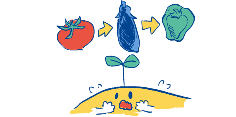 | 同じ野菜ばかり同じところに植えている | 同じ科の野菜を植えることで、土から吸収する栄養素や野菜に住み着く生物がほとんど同じになり、だんだんとバランスが崩れていきます。 | |